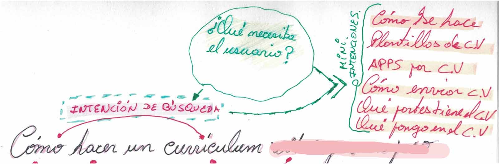 Si aislamos “Cómo hacer un currículum” de la oración completa, tenemos la intención del usuario, es decir, el usuario quiere aprender cómo se hace un currículum, hasta aquí nada nuevo, pero…. ¿cómo podemos enseñarle nosotros a crear un currículum? o ¿qué hay detrás de esa intención? Lo que hay detrás son las micro intenciones.