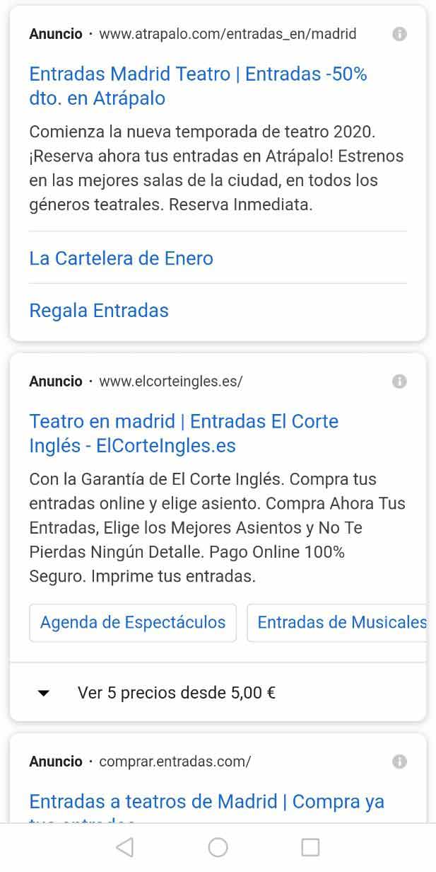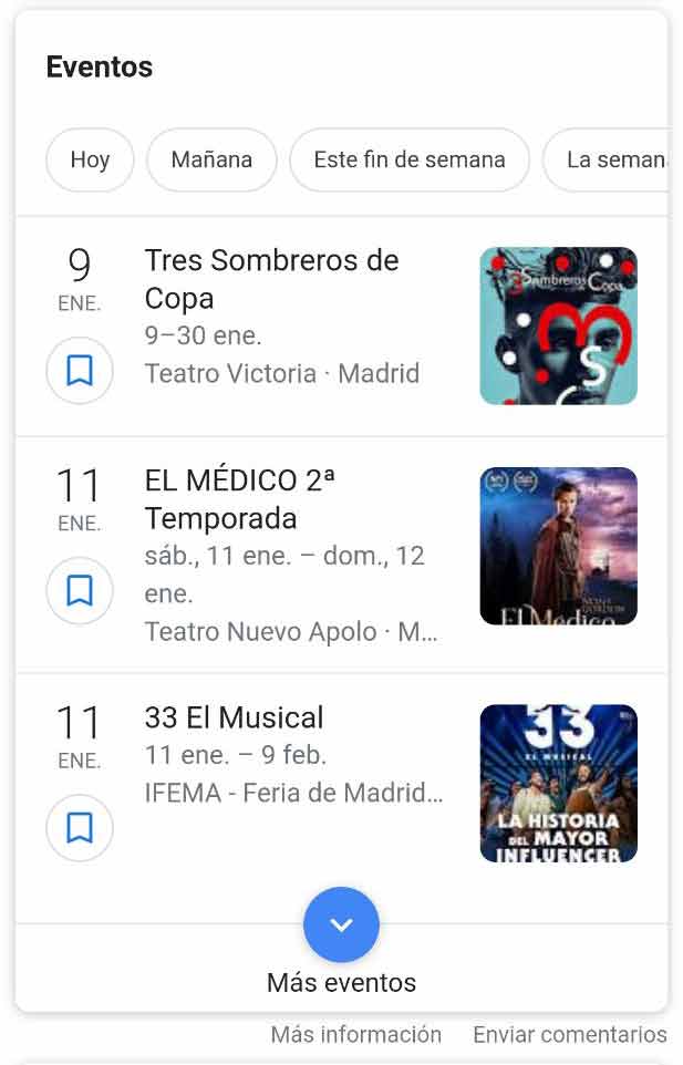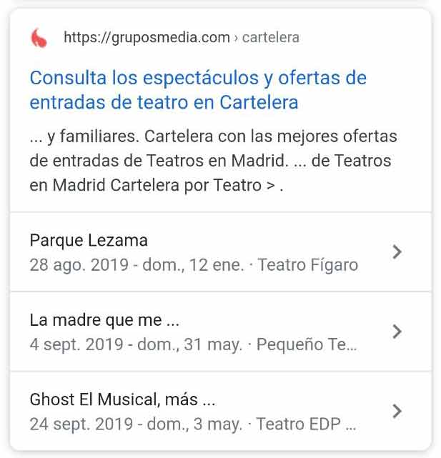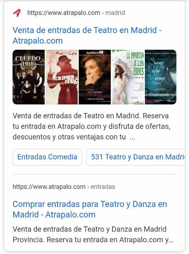 - Snippet orgánico con eventos, en este caso para comprar billetes de taquilla: