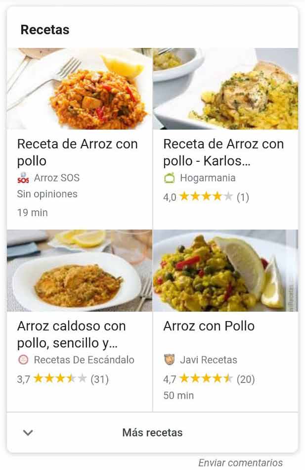 - Featured Snippet de Recetas ¿por qué es un featured snippet? porque está arriba del todo y lo crea Google automáticamente (nunca olvides esto):